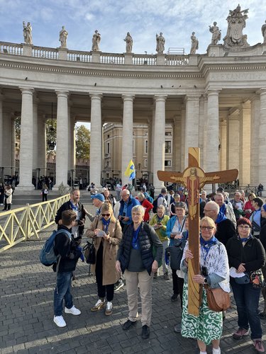 Der Morgen des zweiten Tages startete mit einem beeindruckenden und bewegenden Pilgerweg von der Engelsburg über die Via de la Conciliazione, über den Petersplatz in die Peterskirche. Gemeinsam beteten wir, verbunden über die Kopfhörer, vorne weg abwechselnd Pilgerinnen und Pilger, die ein Holzkreuz trugen und die Gruppe leiteten. Das Tragen des Kreuzes löste tiefe Berührung aus. Der Weg führte vom Obelisken auf dem Petersplatz hinein in den Petersdom durch die Heilige Pforte. Angekommen im Petersdom feierte die Reisegruppe einen Gottesdienst. Ein erhabenes Gefühl machte sich breit, in diesem denkwürdigen Dom, gemeinsam eine Messe zu feiern.